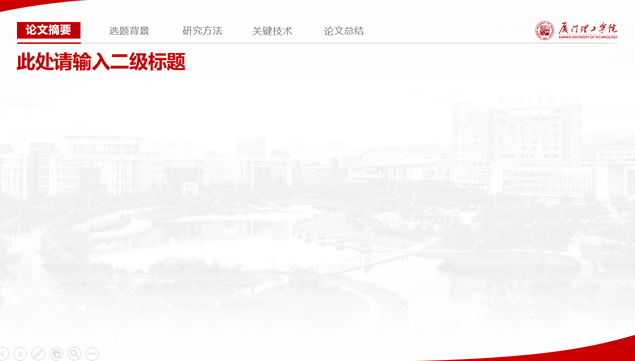 简介:厦门理工学院校徽,厦门理工学院校园风光大图封面,论文摘要、选题背景、研究方法、关键技术、论文总结,封面页,过渡页,内容页,结束页,厦门理工学院应届生论文答辩通用ppt模板。