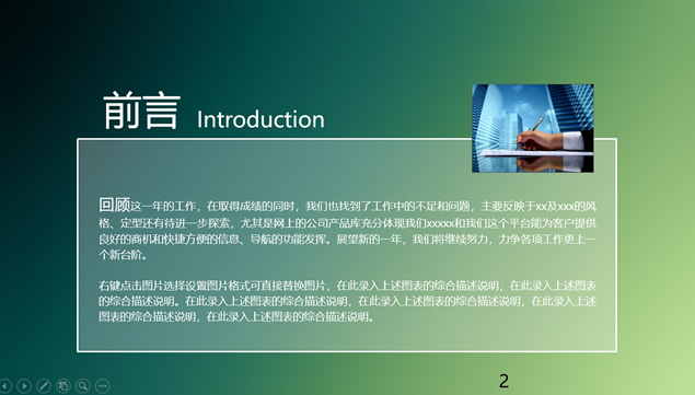 简介:关于我们,企业文化,产品和服务,展望未来,联系我们,绿色渐变背景,半透明风格设计,精美图文排版,使用图标图表,绿色渐变背景简约iOS风格公司介绍ppt模板。