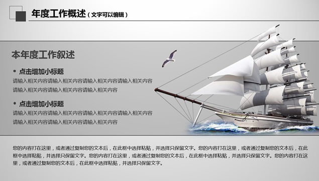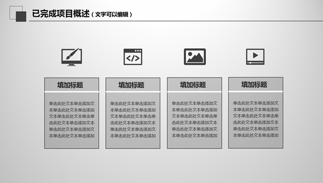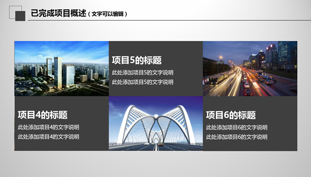 简介:工作总结与计划ppt模板,目录:年度工作叙述,本年度工作完成情况,成功项目展示,新的一年工作计划,三角形视觉创意封面与过渡页,简约经典灰设计,完整框架商务工作总结与计划ppt模板。