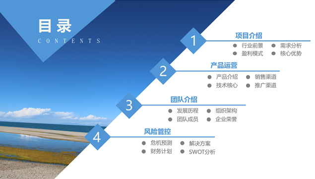 简介:蓝海背景风景大图,几何形状创意,庄重蓝配色,简约扁平化设计,大气商业计划书ppt模板。