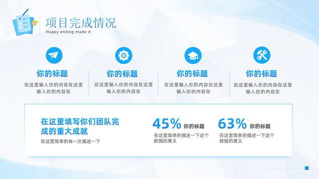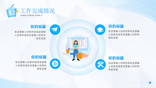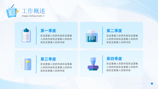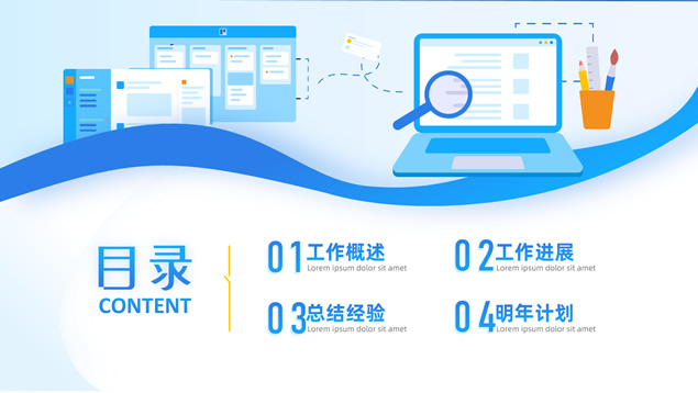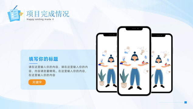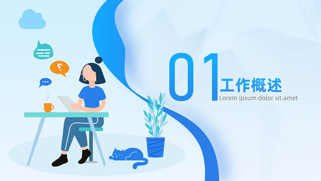 简介:矢量插画风工作总结报告ppt模板,本模板共26P,矢量商务办公主题插画流体几何风创意设计封面、目录页、过渡页,渐变蓝配色,简约精美实用图表,流体几何风版式内容页,适合工作总结、工作汇报等场景应用的插画风商务通用ppt模板,“P界达人”软软作品。