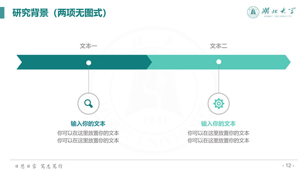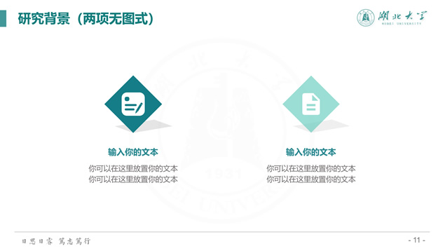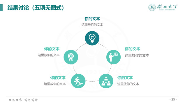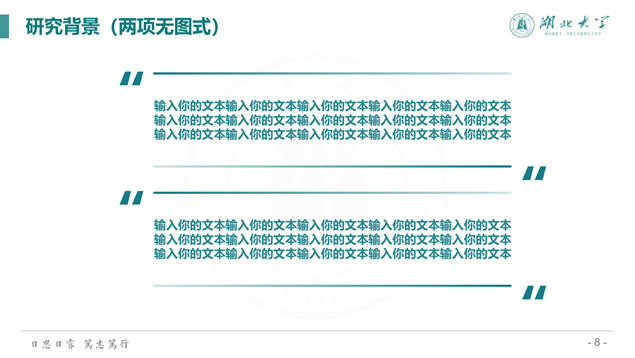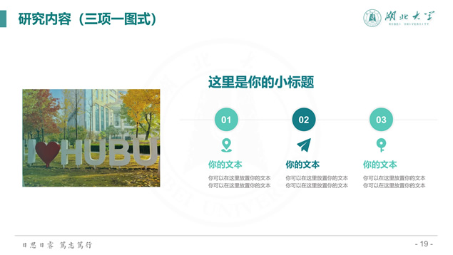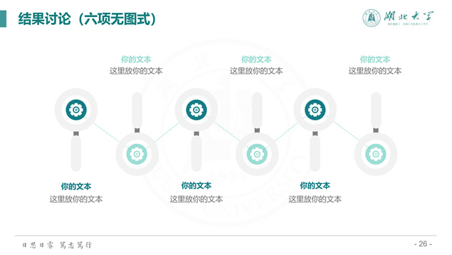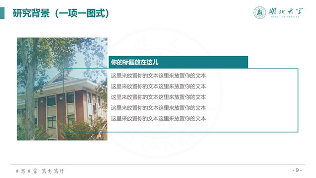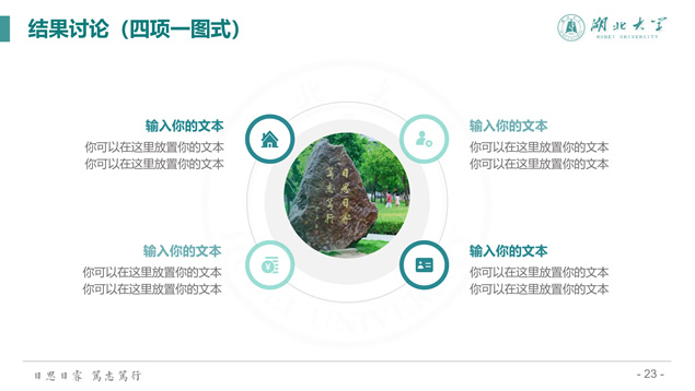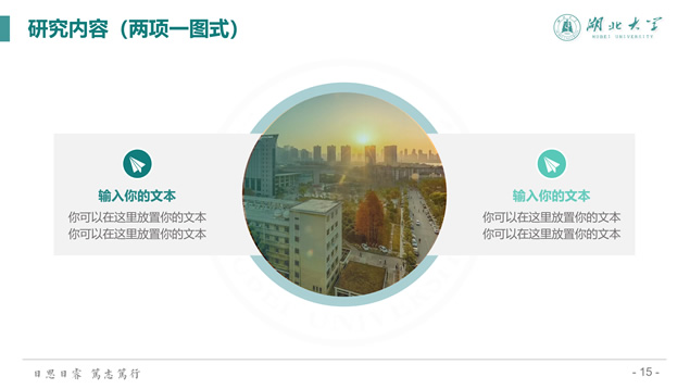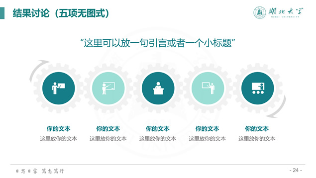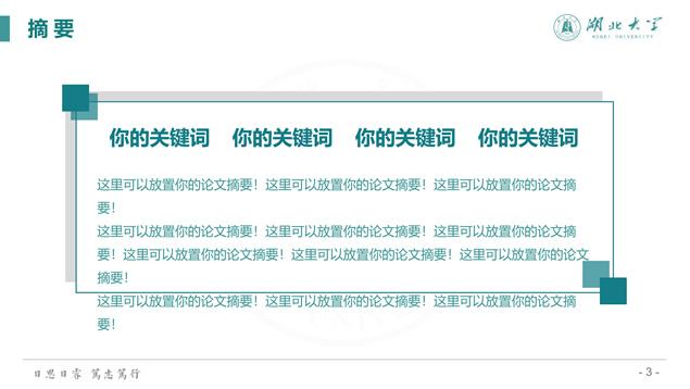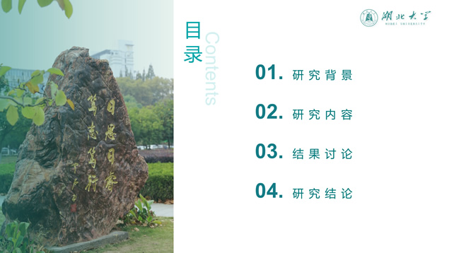简介:渐变清新蒙版湖北大学毕业答辩通用ppt模板,本模板共39P,校徽、校园主教学楼背景渐变蒙版创意设计封面,简约扁平化设计,小清新绿配色,精美简约实用图表,适合湖北大学应届生论文答辩、毕业总结、学术汇报等场景应用的通用ppt模板。