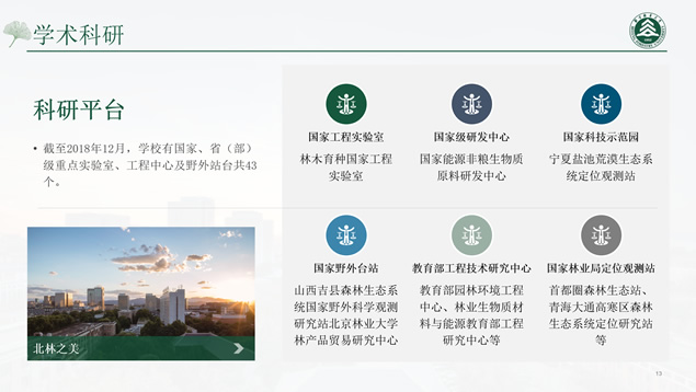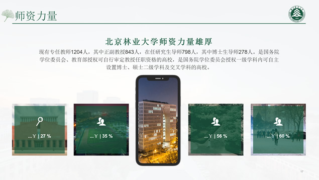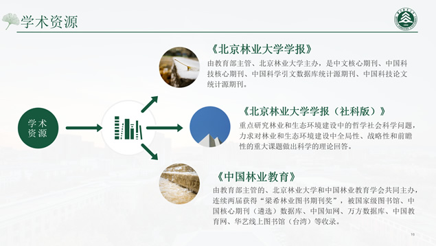 简介:北京林业大学论文答辩通用ppt模板,本模板共27P,校园标志性建筑、校徽、大标题创意设计封面、过渡页,环保绿配色,扁平化设计图表,校园风光素材图片配图图文排版,适合北京林业大学应届生论文答辩、毕业总结通用的ppt模板,“P界达人”小美作品。