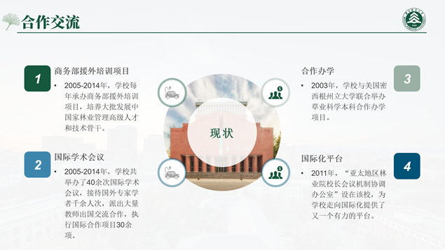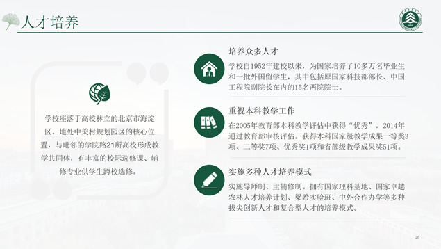 简介:北京林业大学论文答辩通用ppt模板,本模板共27P,校园标志性建筑、校徽、大标题创意设计封面、过渡页,环保绿配色,扁平化设计图表,校园风光素材图片配图图文排版,适合北京林业大学应届生论文答辩、毕业总结通用的ppt模板,“P界达人”小美作品。![点击放大 [免费]北京林业大学论文答辩通用ppt模板](https://www.08i8.com/wp-content/uploads/2020/08/1597403997-540d2fed272d22c.jpg)