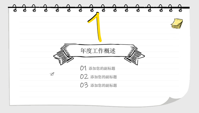 简介:简约铅笔手绘年终总结新年计划ppt模板,目录:年度工作概述、工作完成进度、工作存在不足、新年工作计划,横格记事本背景,铅笔手绘卡通商务小人主图,简约大气小清新极简约手绘风,气泡、标签、梯子、手势、循环箭头、递进箭头、文本框、圆圈、台式电脑、坐标、灯泡、书本、箭头靶心、小旗子、商务人物等精美手绘素材配图,适合年终总结新年计划等场景应用的手绘ppt模板。