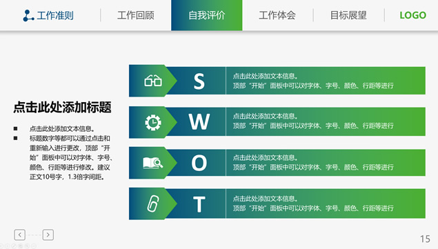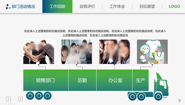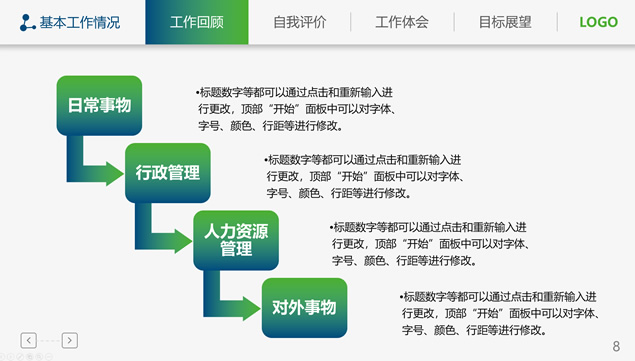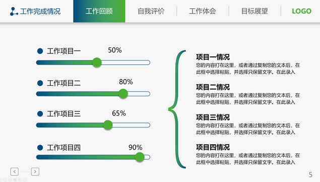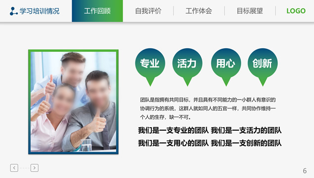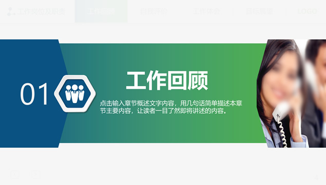 简介:完整版述职报告ppt模板,目录:工作回顾、自我评价、工作体会、工作展望,3D小人冲破终点主图,空间感几何图形创意封面,淡雅灰背景,蓝绿渐变配色,仿网页菜单切换效果设计,微立体风格图表,追求让梦想更接近,这是一个新的开始,开始新的一段旅程,适合述职报告、自我介绍等场景应用的蓝绿渐变完整版ppt模板。