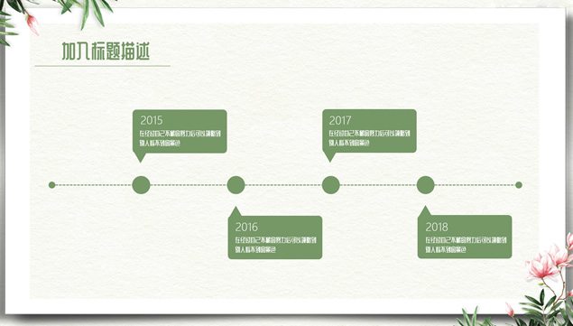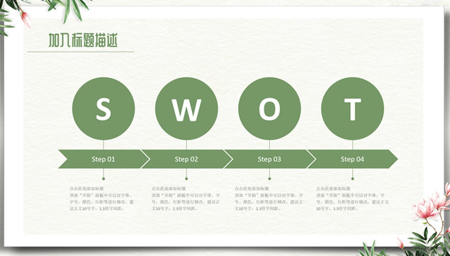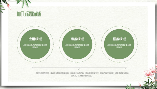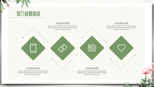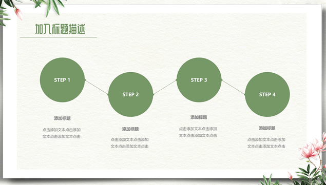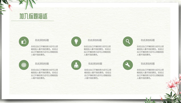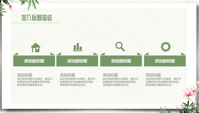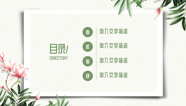 简介:淡雅小清新绿粗糙纸质背景,树叶、花草、鸟儿主题图片、雅致相框创意封面、目录页、过渡页,简约扁平化图表,小清新绿配色,适合商务汇报、工作总结、工作汇报等场景应用的花草鸟儿小清新绿唯美文艺风ppt模板。
