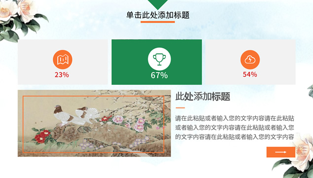 简介:淡雅蓝水彩背景,花儿枝头鸟儿主图,小清新绿配色,文艺风设计,微立体图表,精美图文排版,适合工作汇报、述职报告等场景应用的文艺风ppt模板,鸟语花香,花鸟植物小清新文艺风ppt模板。![点击放大 [免费]鸟语花香——花鸟植物小清新文艺风ppt模板](https://www.08i8.com/wp-content/uploads/2020/08/1597405008-7d59354678739f0.jpg)