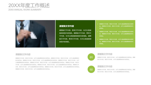简介:扁平小清新绿工作总结计划ppt模板,目录:年度工作概述、工作完成情况、成功项目展示、明年工作计划,绿草主图封面、过渡页,简约扁平化设计,小清新绿配色,精美图表图文排版,适合工作总结、工作汇报、工作计划等场景应用的绿草小清新扁平ppt模板。![点击放大 [免费]绿草小清新扁平工作总结计划ppt模板](https://www.08i8.com/wp-content/uploads/2020/08/1597405337-3f2c28214c92d5e.jpg)