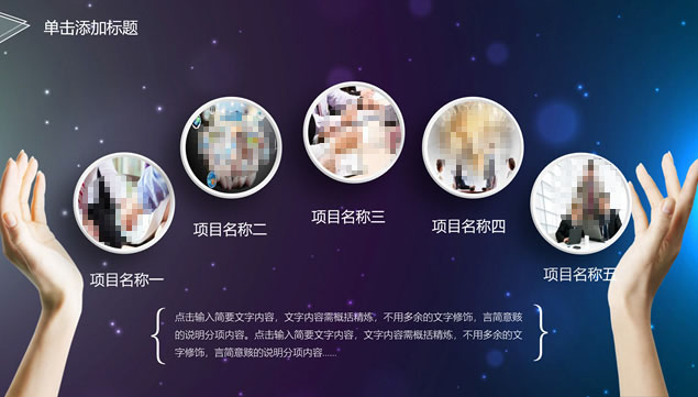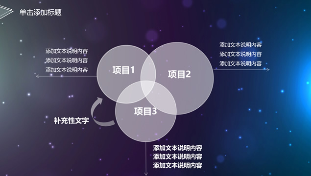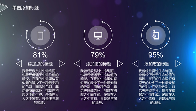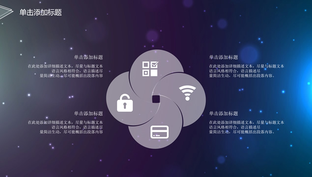 简介:蓝紫渐变唯美星空背景,圆、矩形几何图形线条创意设计,半透明元素图表,简约扁平化大气设计,适合商务工作汇报、工作总结报告的唯美星空背景iOS风格ppt模板。