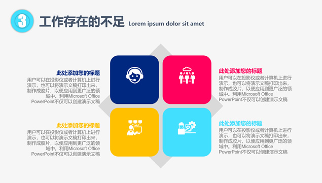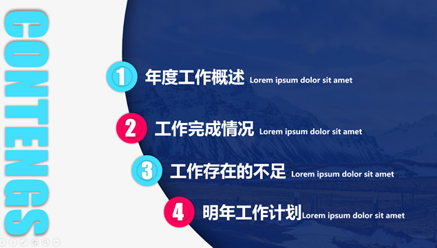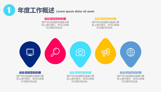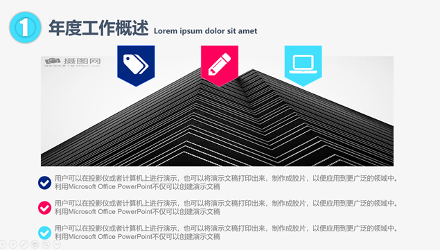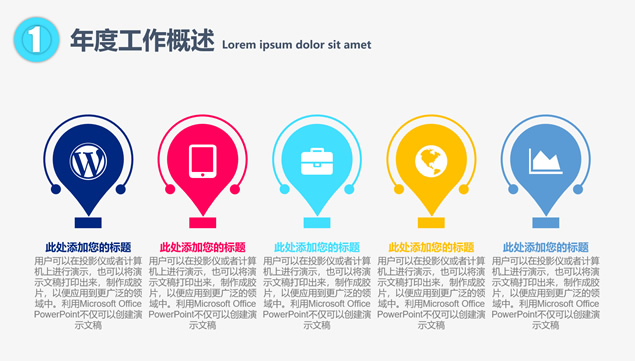 简介:年度工作概述、工作完成情况、工作存在不足、明年工作计划,点线圆创意封面过渡页,半圆裁图目录页,精美扁平化四色图表,大气时尚风格设计,适合年度总结、新年工作计划的点线圆大气时尚风商务通用ppt模板。