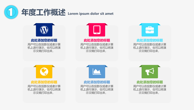 简介:年度工作概述、工作完成情况、工作存在不足、明年工作计划,点线圆创意封面过渡页,半圆裁图目录页,精美扁平化四色图表,大气时尚风格设计,适合年度总结、新年工作计划的点线圆大气时尚风商务通用ppt模板。![点击放大 [免费]点线圆大气时尚风商务总结汇报ppt模板](https://www.08i8.com/wp-content/uploads/2020/08/1597405896-299e0f021d3f1f7.jpg)