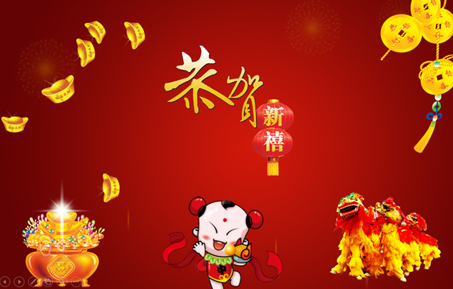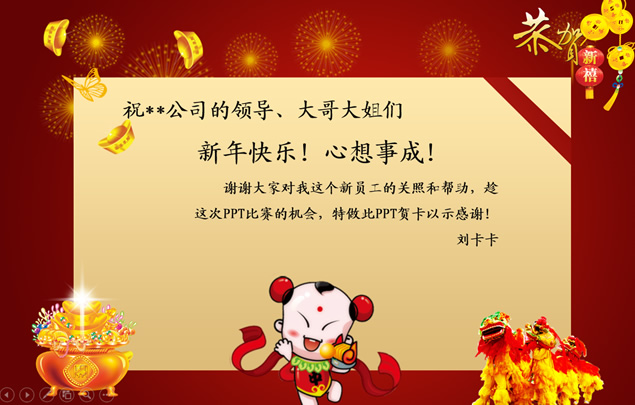 简介:招财童子,大红灯笼,吉祥结,舞狮,元宝,恭贺新禧,新年祝福贺卡,适合公司统一给员工发送的ppt动态祝福贺卡模板。