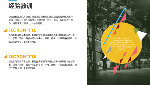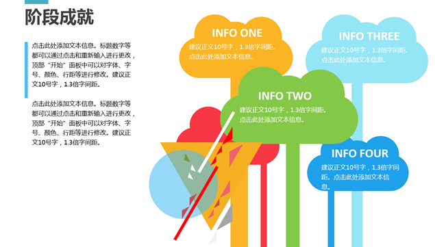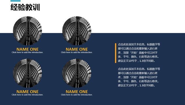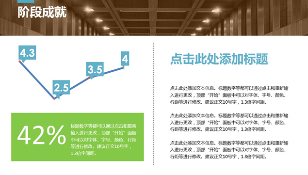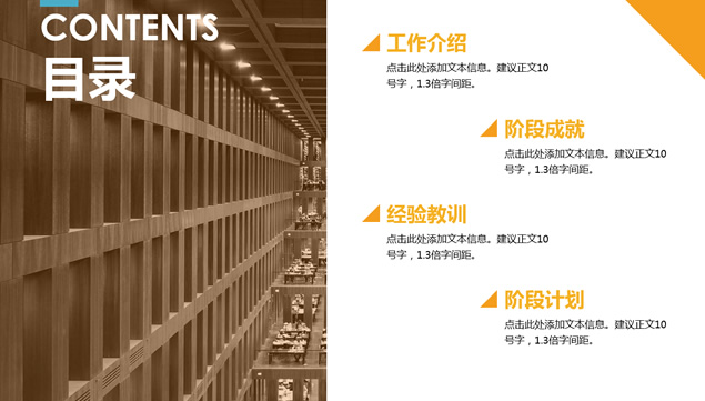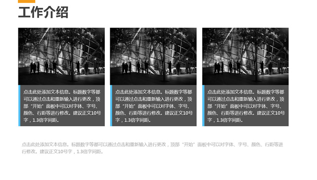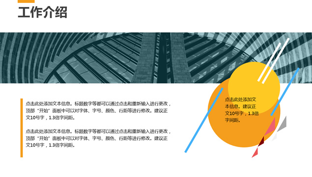 简介:工作介绍,阶段成就,经验教训,阶段计划,转场视觉感动画效果,扁平化工作总结汇报ppt模板。